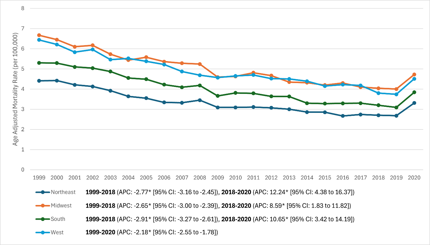 Joinpoint APCs (1999–2018): Northeast –2.77%/year, Midwest –2.65%/year, South –2.91%/year (all P < 0.01); West –2.18%/year with no joinpoint detected. Post-2018 APCs: Northeast +12.24%/year (P = 0.003), Midwest +8.59%/year (P = 0.011), South +10.65%/year (P = 0.004); West increased in 2020 without a detected joinpoint. Net 1999–2020 AAPCs across regions were still negative (≈ –1.4% to –1.7%/year; P < 0.001). By 2020, the regional gap narrowed somewhat, but the Midwest/West remained higher than Northeast.