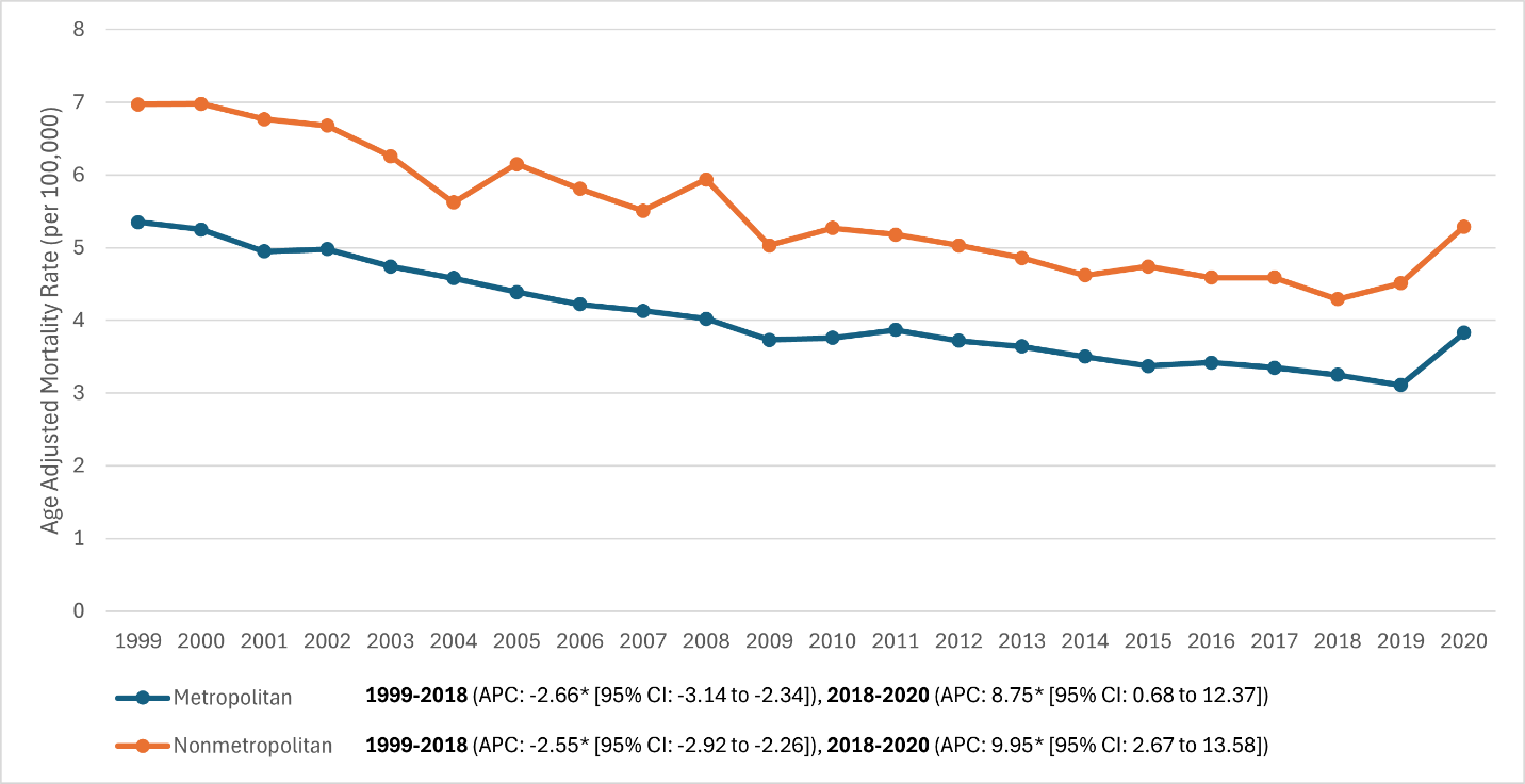 Joinpoint APCs: Metro –2.66%/year (1999–2018; P = 0.002) then +8.75%/year (2018–2020; P = 0.033); Nonmetro –2.55%/year (1999–2018; P < 0.001) then +9.95%/year (2018–2020; P = 0.006). CIs overlapped between urban and rural APCs, indicating parallel long-term improvements and pandemic-era setbacks; the absolute burden remained higher in rural areas.