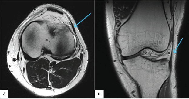 Figure 1: Axial (a) and coronal (b) T2-weighted magnetic resonance imaging images of the left knee joint show focal thickening of lateral patellar retinaculum (sky-blue arrow), which is classically described as the lateral patellotibial ligament.