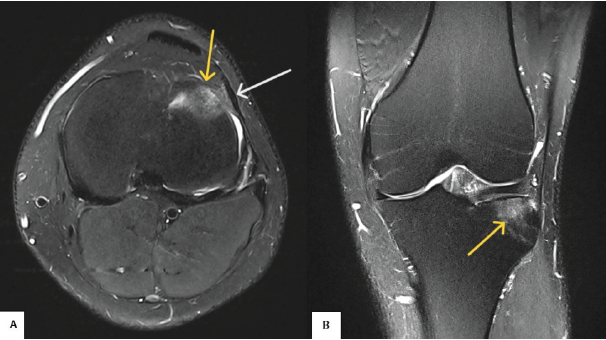Figure 2: Axial (a) and coronal (b) proton density fat-suppressed images of the left knee joint show marrow edema (yellow arrow) at the anterolateral aspect of the tibial plateau (Gerdy’s tubercle) near tibial insertion site of lateral patellar tibial ligament (white arrow).