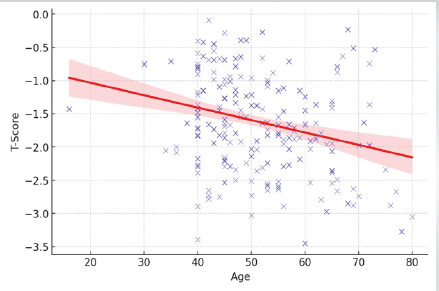 The age and symptoms of osteopenia were the two variables which significantly determined the predictive power of QUS in diagnosing osteopenia. The T-score was found to be less in older population. The relationship of age and T-score is depicted as under (Fig. 1). Similarly, the QUS study had showed that symptomatic patients had less T-score and it was statistically significant. All other variables did not influence the predictive power of this tool.