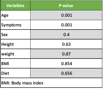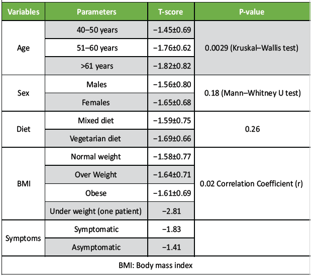 The P-value and multivariate regression analysis were done to assess factors having statistical significance in influencing T-score in the study population.