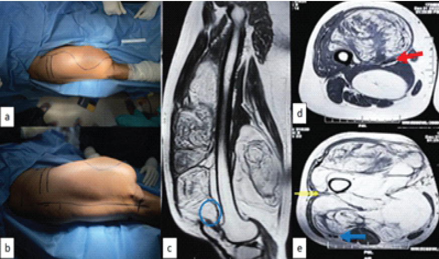 Figure 1: Intraoperative picture of thigh and pre-operative magnetic resonance imaging (MRI); (a) superior view showing medial incision sacrificing medial skin and islanding out all previous surgical and biopsy scars, (b) lateral view showing lateral incision, (c) MRI with sagittal image showing proximity to femur and tumor extent up to suprapatellar pouch (blue round), (d) axial section through proximal part of tumor showing vessels (red arrow) lying between two parts of the tumor, and (e) axial section through distal part showing vicinity of tumor with sciatic nerve (blue arrow) and only virgin plane (yellow arrow) through which femur can be reached.
