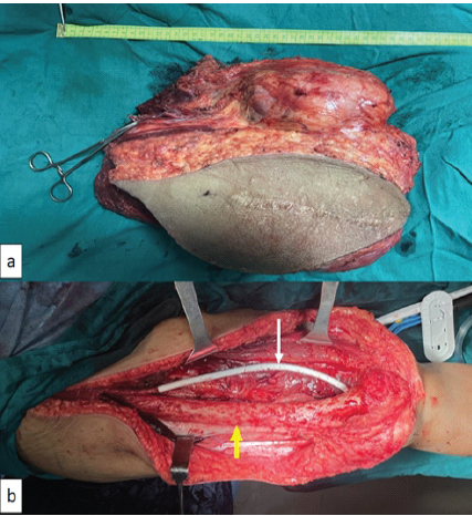 Figure 2: Resected specimen and intraoperative image after vessels reconstruction; (a) resected specimen with sacrificed skin, with proximal end of femoral vessels clamped with mosquito and (b) intraoperative picture showing femoral vessels reconstruction with polytetrafluoroethylene graft (white arrow), and femur (yellow arrow) denuded of its periosteum.