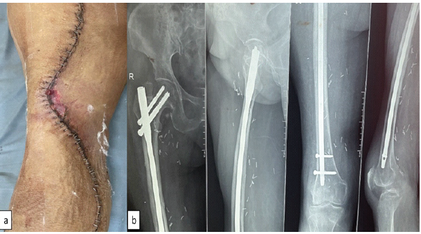Figure 3: Post-operative image of the wound and radiograph; (a) post-operative image showing superficial skin necrosis managed conservatively and (b) radiograph showing prophylactic nailing at a second stage to prevent radiotherapy-induced fracture.