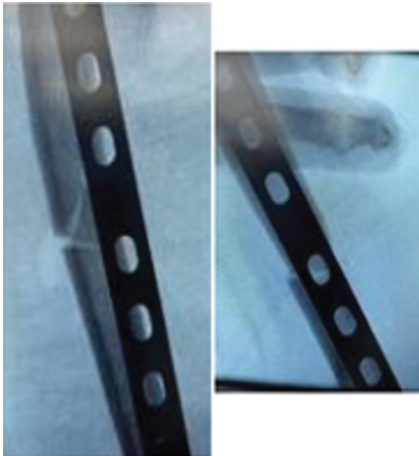 ORIF with DCP Plating : Conventional Anterolateral approach or a posterior approach was used to reduce fracture by open reduction and then an adequate sized DCP plate was used to stabilise it with at least 7-8 screws.