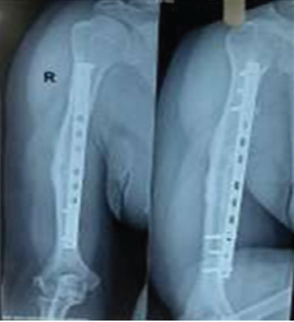 under c-arm guidance. Then distal most screw was inserted. Finally, four more screws – 2 proximal and 2 distal were inserted depending on the access through the surgical incision window. Arm sling pouch was given and elbow range of motion was started immediately, shoulder motion was started at 2 weeks. Case follow-up radiological and clinical images- Figures 5-8. Fluoroscopy shoots are taken frequently during this procedure to confirmed the placement of the plate (equidistant from the fracture and maintain the working length), reduction of the fracture site and screw length.