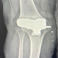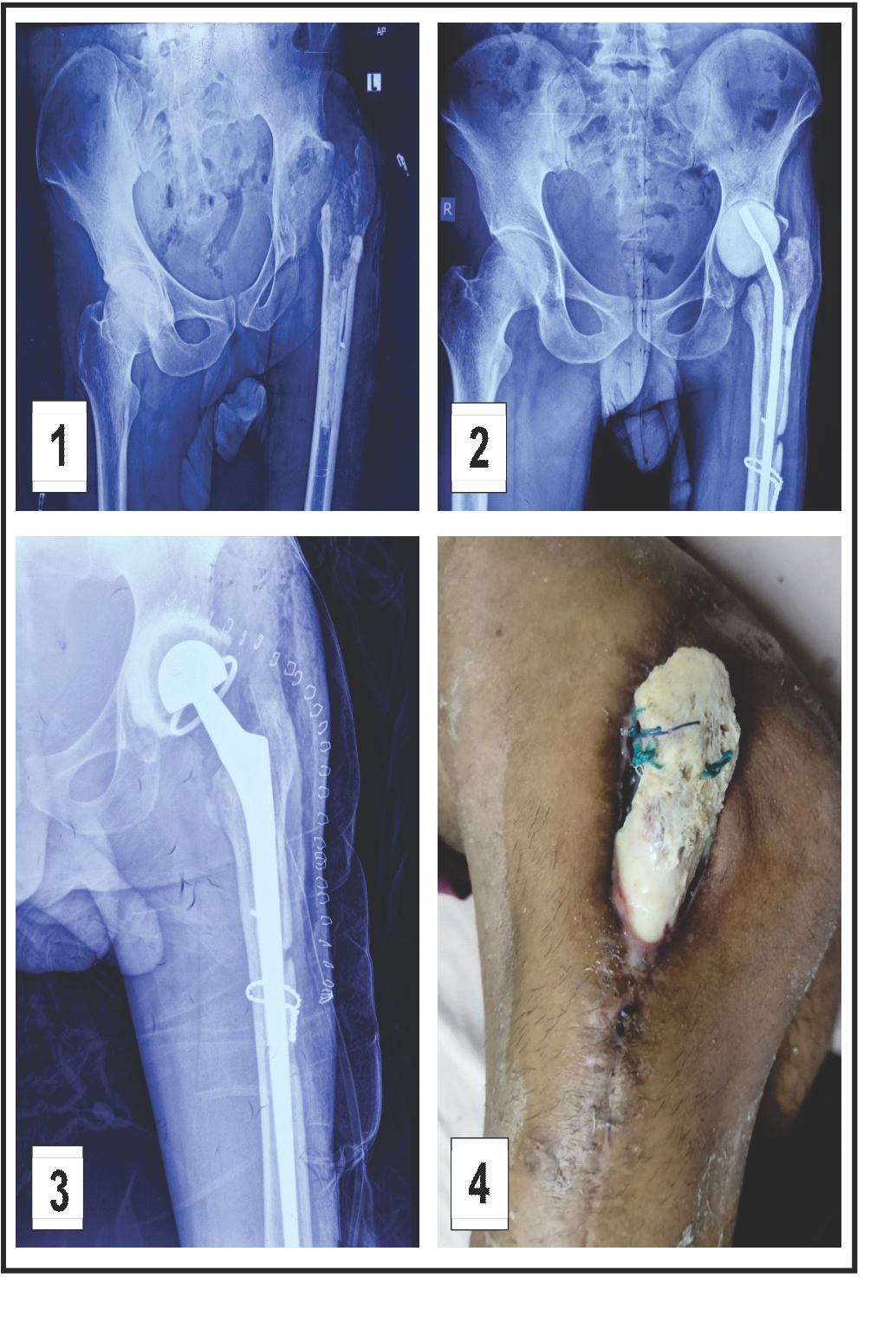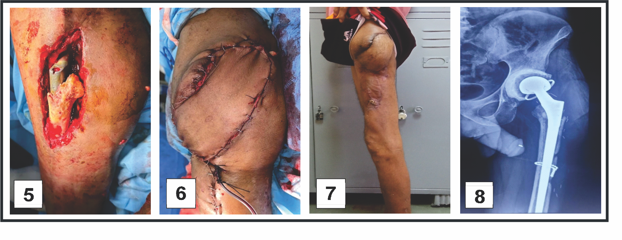 Stage 2 included removal of the antibiotic spacer and implantation of a new prosthesis (Fig. 3). Due to the absence of identifiable abductor musculature intraoperatively, a constrained acetabular cup was utilized. The 1st post-operative week was uneventful. However, by the end of the 2nd post-operative week, the surgical site dehisced with purulent discharge. Subsequently, the entire greater trochanter became exposed and devitalized, with concurrent exposure of the trunnion (Fig. 4). In consultation with a plastic surgeon, the decision was made to proceed with DAIR and flap coverage. All devitalized bone was debrided until healthy bleeding points were observed (Fig. 5). Simultaneously, a musculocutaneous anterolateral thigh flap was raised and inset by the plastic surgery team (Fig. 6). Multiple drains were placed. Postoperatively, the patient received intravenous piperacillin-tazobactam and linezolid for 6 weeks. Culture of intraoperative samples was negative. Sutures were removed on post-operative day 14. The patient was advised to remain on non-weight-bearing mobilization from post-operative day 2. Hip range-of-motion exercises and partial weight-bearing ambulation were initiated during the 3rd post-operative week, progressing to full weight-bearing by the 6th week. At the 3-month follow-up, the flap had healed successfully (Fig. 7). Inflammatory markers at that time were CRP 4.1 mg/L and ESR 28 mm/h. Post-operative radiographs were obtained at 6 weeks, 6 months, and 12 months (Fig. 8). At the most recent follow-up (12 months), the patient was ambulant with walker support and doing well clinically.