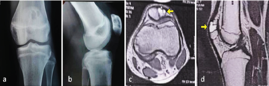 A 16-year-old male cricketer presented with a 2-month history of dull aching, anterior knee pain that had aggravated over the preceding 2 weeks. The pain was exacerbated by physical activities but did not restrict mobility. There was no history of trauma. Clinical examination revealed quadriceps muscle wasting with no obvious swelling or tenderness. The range of motion was preserved, while floating patella test and special tests for ligamentous injuries were negative. Plain radiographs of the left knee showed a well-defined lytic lesion along the superolateral aspect of the patella, with a narrow zone of transition and no perilesional sclerosis (Fig. 1). The joint space remained unaffected. Magnetic resonance imaging (MRI) revealed a 2.5 × 1.4 × 2.1 cm mild expansile patchy lesion with clear margins, and narrow zone of transition, hypointense on T1 and hyperintense on T2. Multiple fluid-fluid levels were observed on sagittal T2 sequences, leading to a pre-operative diagnosis of ABC of the patella (Fig. 1).
