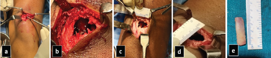 Figure 2: Intraoperative photographs demonstrating (a) intralesional curettage, (b) cavity following tumor removal, (c) transverse and (d) longitudinal measurements of the defect, and (e) dimensions of the harvested iliac crest bone graft.