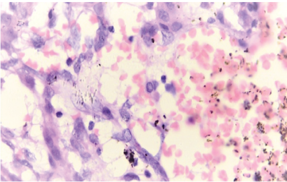Figure 3: Histopathological examination revealed round to polyhedral chondroblasts with hyper-lobulated, grooved nuclei within a pink chondroid matrix, along with osteoclast-like giant cells.
