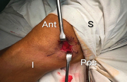 Figure 1: A vertical incision was taken on the anteromedial aspect of the right knee directly over the swelling.