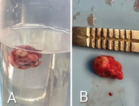 A well-encapsulated, reddish-white mass measuring approximately 1 × 1 × 1 cm (Fig. 2) was identified superficial to the joint capsule, in the natural course of a cutaneous branch of the saphenous nerve, likely the infrapatellar branch. The lesion was excised in toto and sent for histopathological evaluation (Fig. 3).