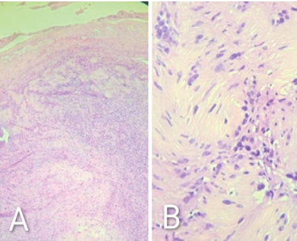 Histopathological examination revealed a well-circumscribed, encapsulated neoplasm composed of two distinct histologic patterns. The first pattern, corresponding to Antoni A areas, displayed compact, spindle-shaped cells arranged in interlacing fascicles with prominent nuclear palisading, forming characteristic Verocay bodies. The second pattern, known as Antoni B areas, showed a more loosely organized, hypocellular architecture with myxoid stroma and scattered cells. These microscopic features were characteristic of a benign peripheral nerve sheath tumor, confirming the diagnosis of schwannoma (Fig. 4).