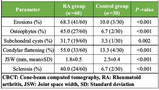 Table 1: Osseous changes on CBCT in RA patients versus controls