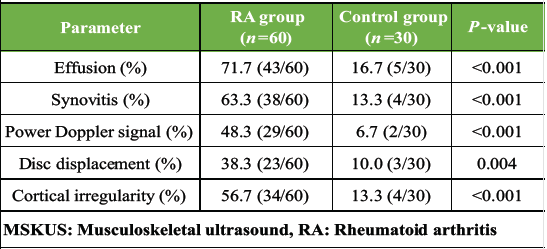 Table 2: Soft tissue changes on MSKUS in RA patients versus controls