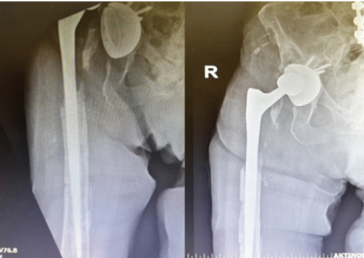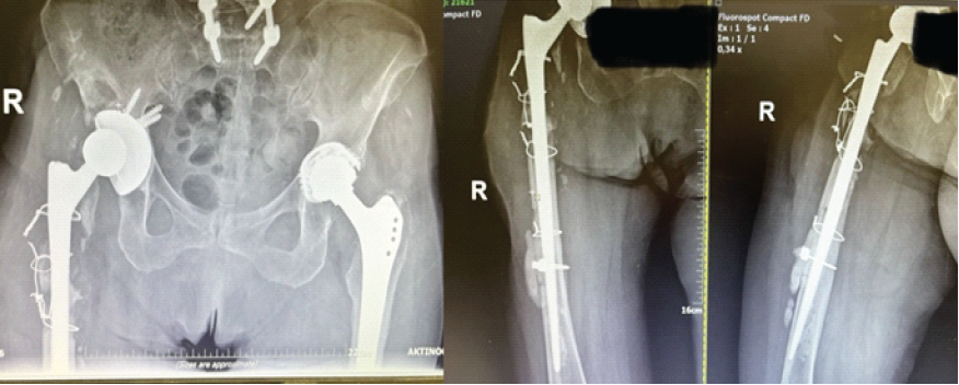 The patient successfully completed the prescribed antimicrobial regimen. At both 6- and 12-month follow-up evaluations, she was seen at the outpatient clinic, where she demonstrated a well-healed surgical wound with no clinical or laboratory evidence of infection. At the latest follow-up, the patient was ambulatory with the aid of a cane and able to perform activities of daily living independently. She reported minimal discomfort in the right hip. Functional assessment using the Harris Hip Score yielded a value of 86, indicating good overall function. Despite the radiographic evidence of proximal femoral bone loss, the patient remained asymptomatic, reporting no pain or functional limitation. Given the absence of clinical symptoms, a conservative approach with close follow-up was elected. Should progressive pain or mechanical compromise develop in the future, reconstruction with a proximal femoral replacement (tumor-type prosthesis) would represent an appropriate surgical option (Fig. 4).