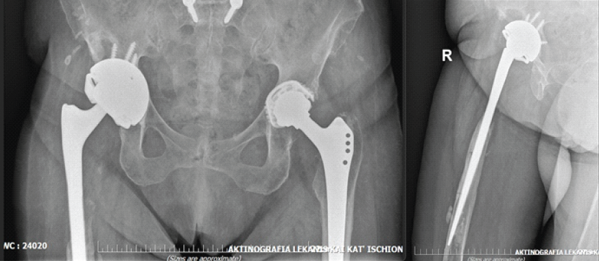 Figure 4: Pelvis anteroposterior (left) and right hip lateral (right) view at 12 months follow-up.