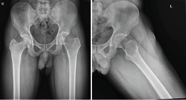 Figure 1: X-ray pelvis shows large lytic cavity in the femoral head, neck, and trochanteric area of the left proximal femur. These are pre-operative X-rays taken before the surgical procedure, at the time of presentation.