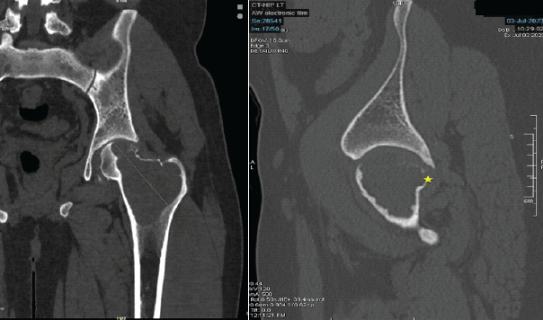 Figure 2: Computed tomography scan shows extent of involvement with breach in the superior cortex portion of femoral head and neck. These are pre-operative computed tomography scan images taken before the surgical procedure, at the time of presentation. These sections confirm the bony involvement and extent of the lytic lesion, essential for pre-operative planning.