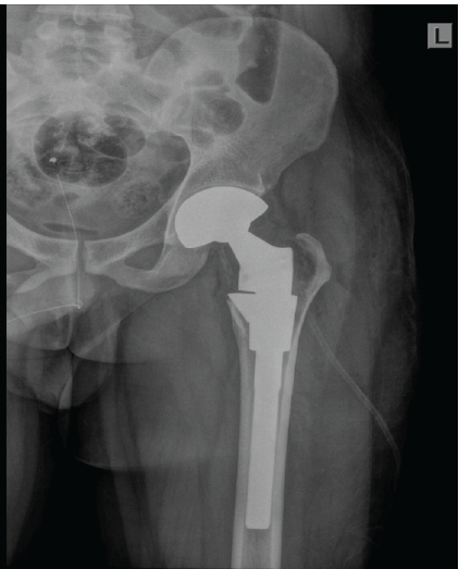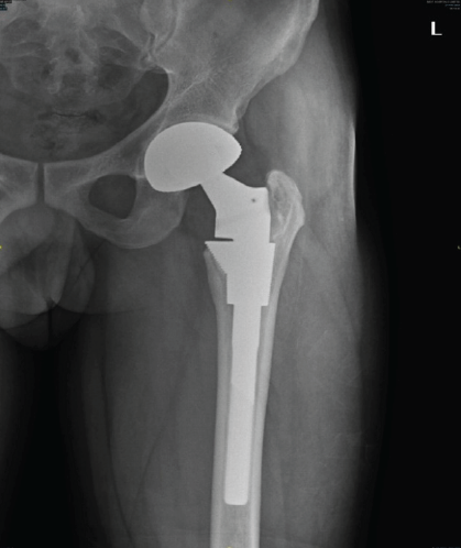 Figure 5: Immediate post-operative X-ray shows well positioned total hip replacement prosthesis with post curettage defect in the medial border of greater trochanter.