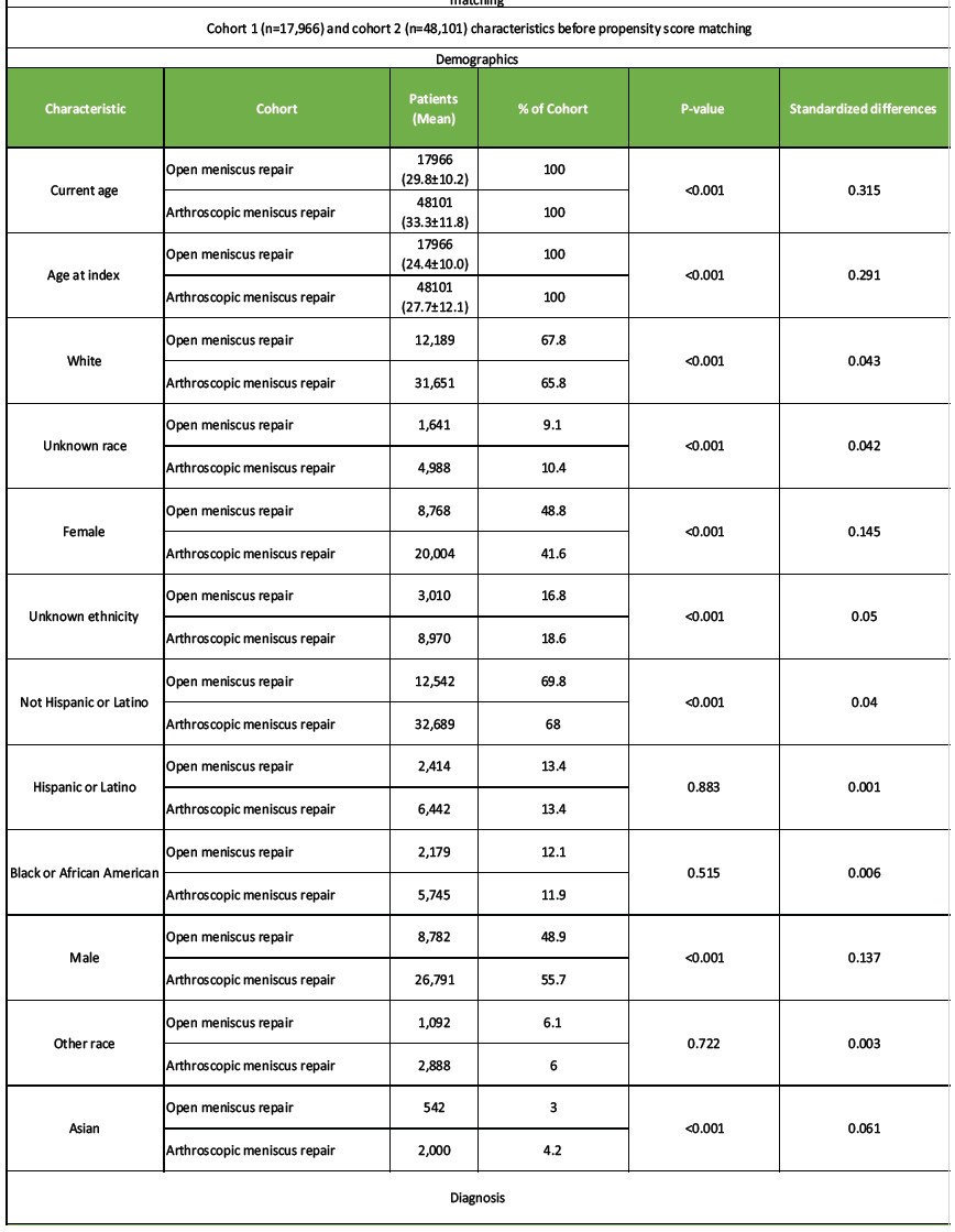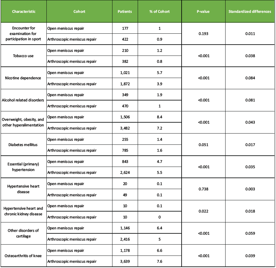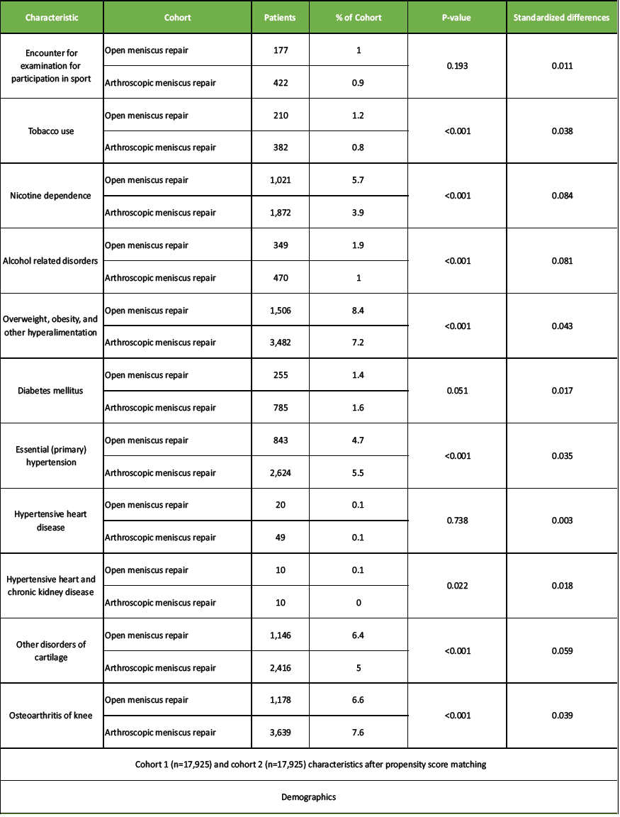 Table 1: Baseline demographic and clinical characteristics of patients undergoing open versus arthroscopic meniscus repair before and after propensity score matching