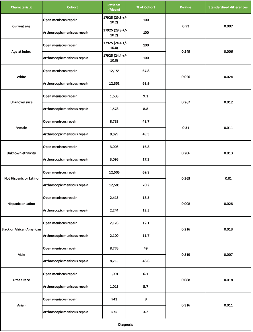 PSM was conducted using logistic regression, including demographics (age, sex, race, and ethnicity) and clinical covariates (body mass index (BMI), diabetes, hypertension, smoking, alcohol use, and prior knee conditions). Matching was 1:1 nearest-neighbor without replacement, with a caliper of 0.1 SD of the logit. 17,925 patients were retained per cohort, excluding only 41 open cases (<0.3%). Post-matching balance was excellent, with standardized differences <0.1 for all covariates. Example: post-match mean age 29.8 years in both groups, and male sex proportion 49.0% versus 48.6%.