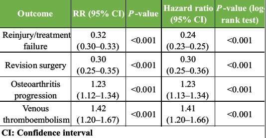 Both RR and HR with 95% CI and P-values are reported. All analyses followed STROBE guidelines and were formatted per Clinical Orthopedics and Related Research standards.