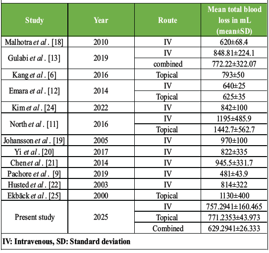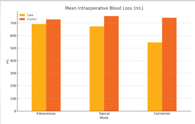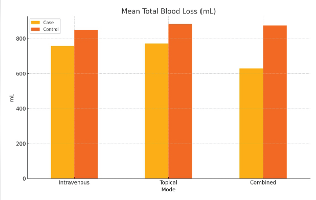 Results: All TXA groups showed reduced blood loss as compared to their controls. Among these, the combined-TXA group demonstrated the lowest total mean blood loss (629.29 ± 26.33 mL), followed by the IV-TXA and topical-TXA group. These differences were statistically significant (P < 0.05). No adverse events were reported in the case or control groups.
