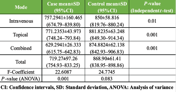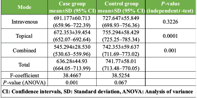 A statistically significant reduction in mean total blood loss was observed across all case groups compared to their respective control groups. The overall mean total blood loss in the case group was (719.27 ± 97.26 mL), whereas in the control group it was (868.90 ± 61.41 mL). Among the three intervention subgroups, the combined-TXA group demonstrated the lowest mean total blood loss (P < 0.05), indicating the greatest efficacy in minimizing perioperative blood loss, followed by the topical group. Post hoc Tukey analysis further suggestive of no statistically significant difference in mean total blood loss between the IV and topical group (P > 0.05), whereas there was a statistically significant difference in mean total blood loss of combined-TXA group with the IV-TXA and topical-TXA group (P < 0.05).