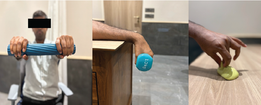 Figure 7: Resistance training using flex bar, dumbbell, and thera-putty.