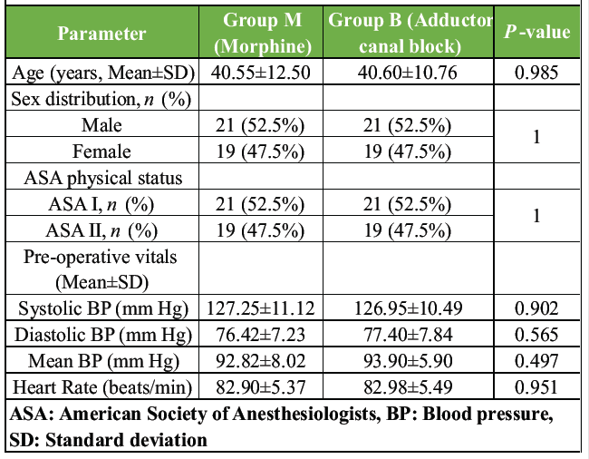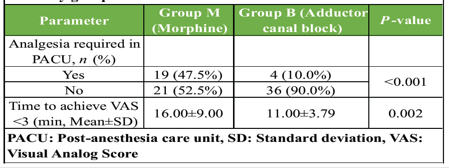 Regarding post-operative adverse effects, patients who received ACB experienced fewer side effects than those who received intravenous morphine (Table 3). The need for antiemetic medication was notably lower in the block group, and no adverse events were reported in either group during the recovery period. This highlights the favorable safety and tolerability profile of ACB compared to systemic opioid analgesia.