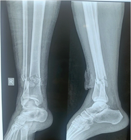 A 65-year-old male patient met with a road traffic accident and sustained a Gustilo Anderson Type-3A fracture of tibia with bone exposed. On radiology, it is of AO 42A3 fracture, that is, extra-articular distal tibial fracture with metaphyseal comminution (Fig. 1). He was treated at a different center initially with debridement and primary fixation with anteromedial fixation with distal tibial LCP and fibula is fixed with a one-third tubular plate (Fig. 2).