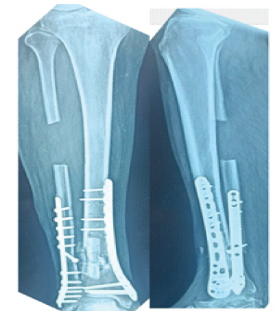 Intraoperatively, the site of non-union is approached under anteromedial approach to tibia over the old scar. The proximal screws of the plate were removed and edges of the fracture are freshened and nibbled. Tibia is reamed with a 6 mm drill bit to stimulate the medullary blood flow.