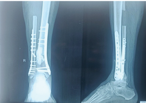 Conclusion: This case shows that even with minimal intervention union can be achieved in notorious distal tibia non-unions if appropriate graft materials are chosen and customized accordingly. Evaluating various biological and mechanical causes of non-union and addressing them is key to favorable outcomes.
