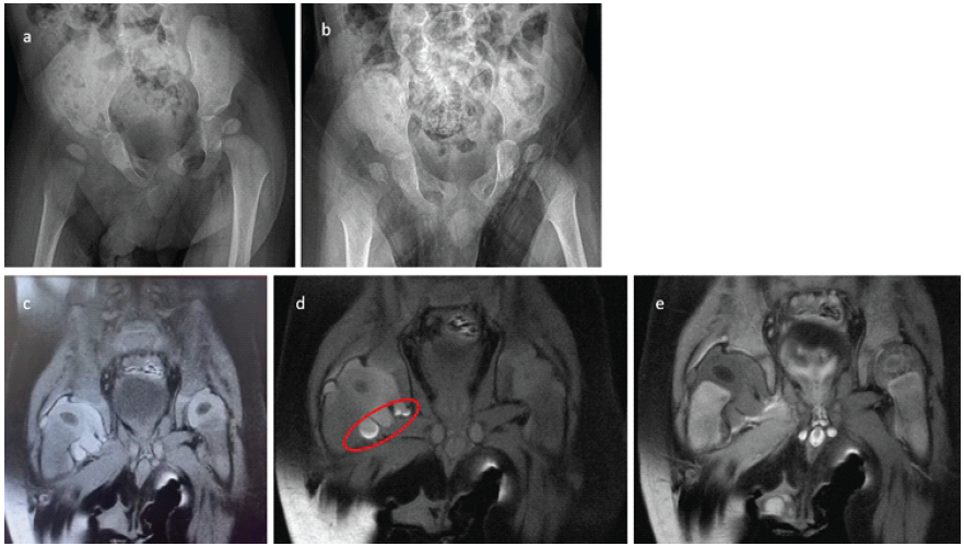 Figure 1: (a) Pre-operative X-ray showing subluxation of the right hip due to effusion. (b) Anteroposterior X-ray taken 12 h post-operatively showing relative relaxation of the right hip compared to the previous day. (c) T1-weighted, coronal fat-saturated magnetic resonance imaging (MRI) revealing a hyperintense effusion in the right hip. (d) T1-weighted, coronal fat-saturated MRI showing blood elements settled in the inferior part of the joint capsule (red circle). (e) T2-weighted, coronal fat-saturated MRI showing hypointense effusion in the right hip, indicative of a blood signal. Both femoral head ossification centers and epiphyses display normal signals, ruling out potential avascular necrosis.