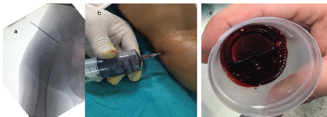 Figure 2: (a) Intraoperative fluoroscopy image showing the introduction of the needle into the right hip. (b) Intraoperative image demonstrating hip joint aspiration with the extraction of bloody effusion. (c) Collected 5 mL of bloody effusion from the right hip, indicative of possible hemarthrosis.