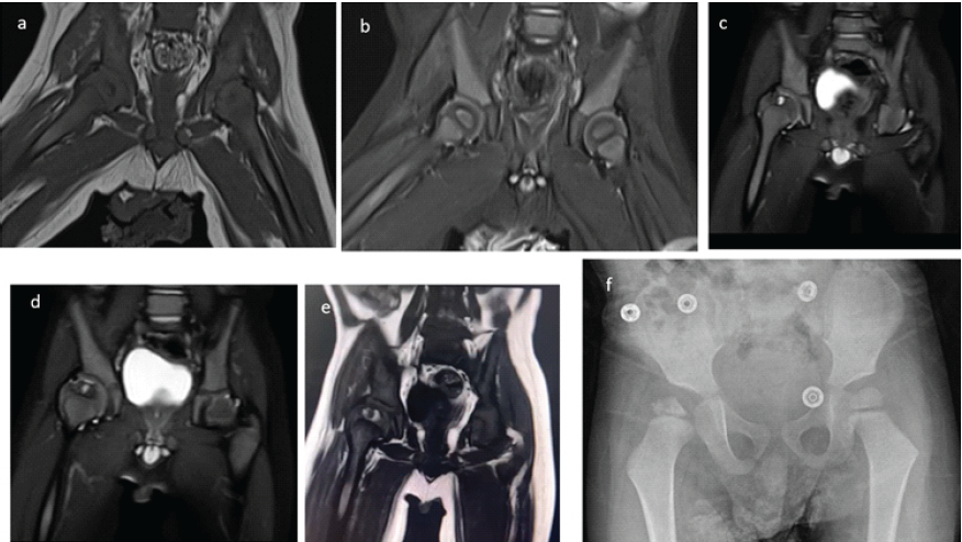 Figure 3: (a) T1-weighted coronal magnetic resonance imaging (MRI) showing the hip reduced to its normal position at post-operative 3 weeks. (b) Coronal short tau inversion recovery MRI showing both femoral heads in place without any signs of avascular necrosis. (c and e) T2-weighted coronal MRI obtained at post-operative 3 years, showing a cystic lesion with a surrounding hyperintense signal on the T1-weighted coronal image. These findings are indicative of hemophilic arthropathy (subchondral cyst caused by recurrent intra-articular hemorrhages leading to hemophilic arthropathy). (f) X-ray at post-operative 3 years showing the extent of deformity.