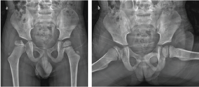 Figure 4: (a and b) X-ray at the 4th post-operative year showing concentric reduction of the femur with flattening and remodeling of the femoral head. Note the slight steepening of the acetabulum compared to the contralateral hip and the previous year. The findings resemble Catterall Grade 3 or Salter-Thompson Type 2b avascular necrosis.