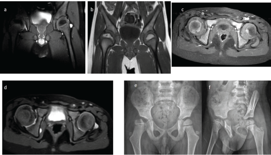 Figure 5: Radiographic evaluation of the patient at the 5th post-operative year. (a) T2-weighted coronal magnetic resonance (MR) image demonstrating similar signal intensity of the epiphysis, indicating limited necrosis of the right femoral head. (b) T1-weighted coronal MR image showing regression of the previously observed subchondral cyst. (c) Contrast-enhanced axial MR image revealing comparable enhancement patterns, suggestive of similar perfusion in both femoral heads. (d) Short tau inversion recovery axial MR image showing increased synovial tissue thickness on the right side without alteration in acetabular anteversion, indicating preserved acetabular development. (e) Anteroposterior pelvic radiograph demonstrating stable femoral head morphology compared with the previous year, with no increase in lateralization or evidence of acetabular dysplasia. (f) False-profile radiograph showing excellent anterior coverage of the femoral head.
