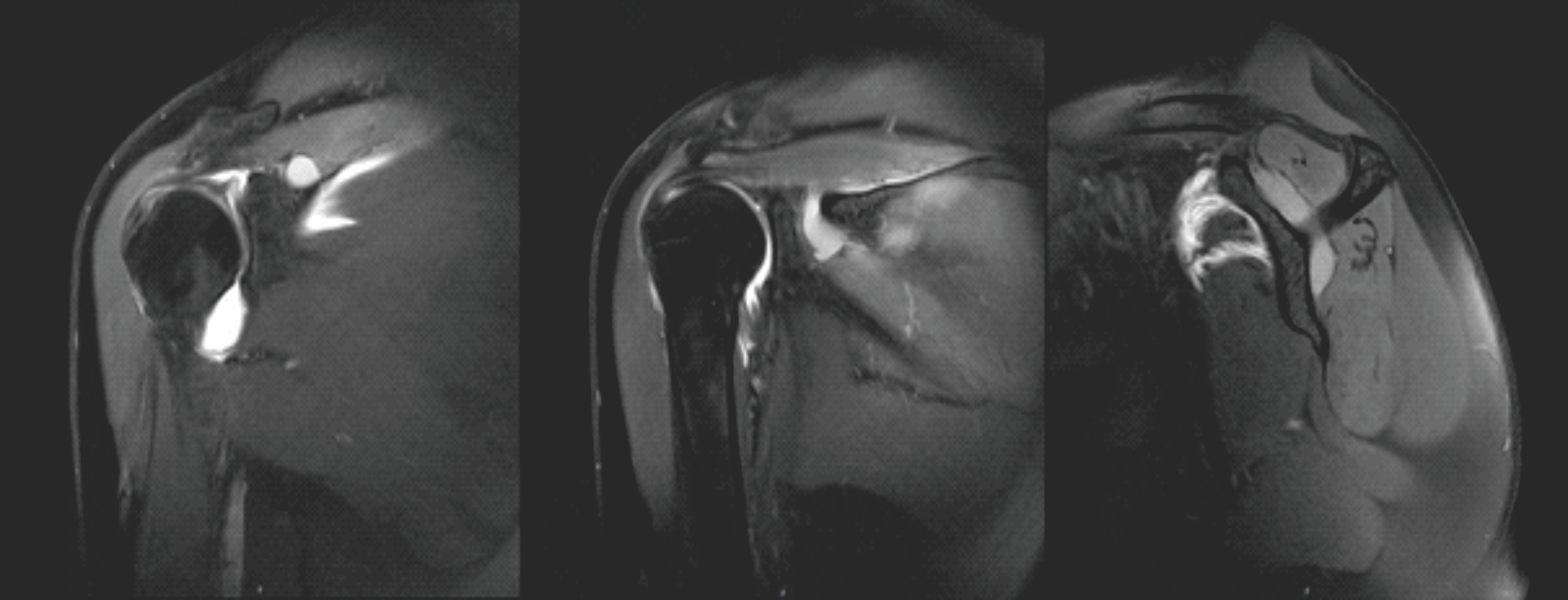 Figure 1: Magnetic resonance imaging of the right shoulder. This figure illustrates cystic formation at the suprascapular notch (left), the spinoglenoid notch (middle), and the tubular connection between the two (right).