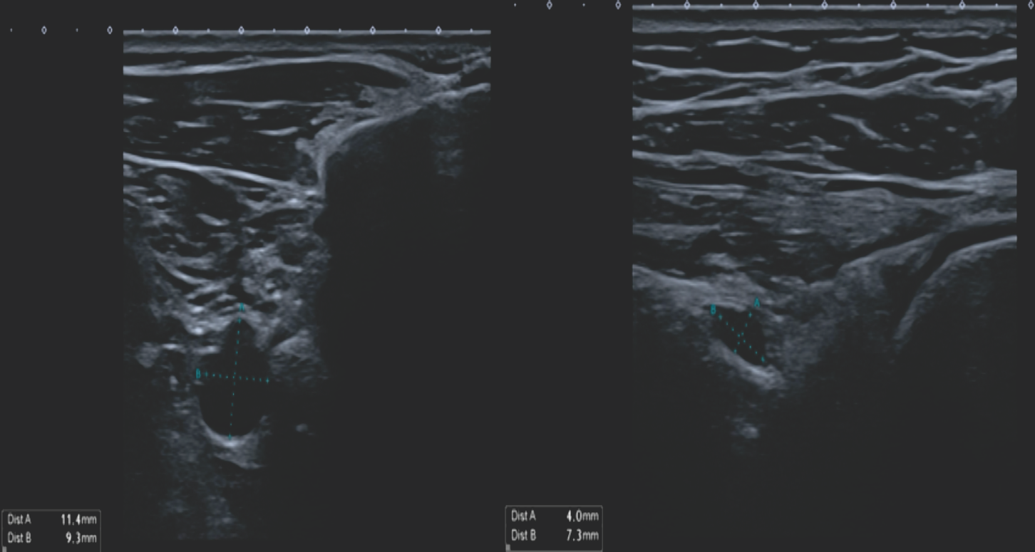 Figure 2: Ultrasound imaging of the right shoulder 3 months after cyst aspiration and intralesional glucocorticoid injection. The cyst shows enlargement at the suprascapular notch (11.4 × 9.3 mm), with a stable size at the spinoglenoid notch (4.0 × 7.3 mm).