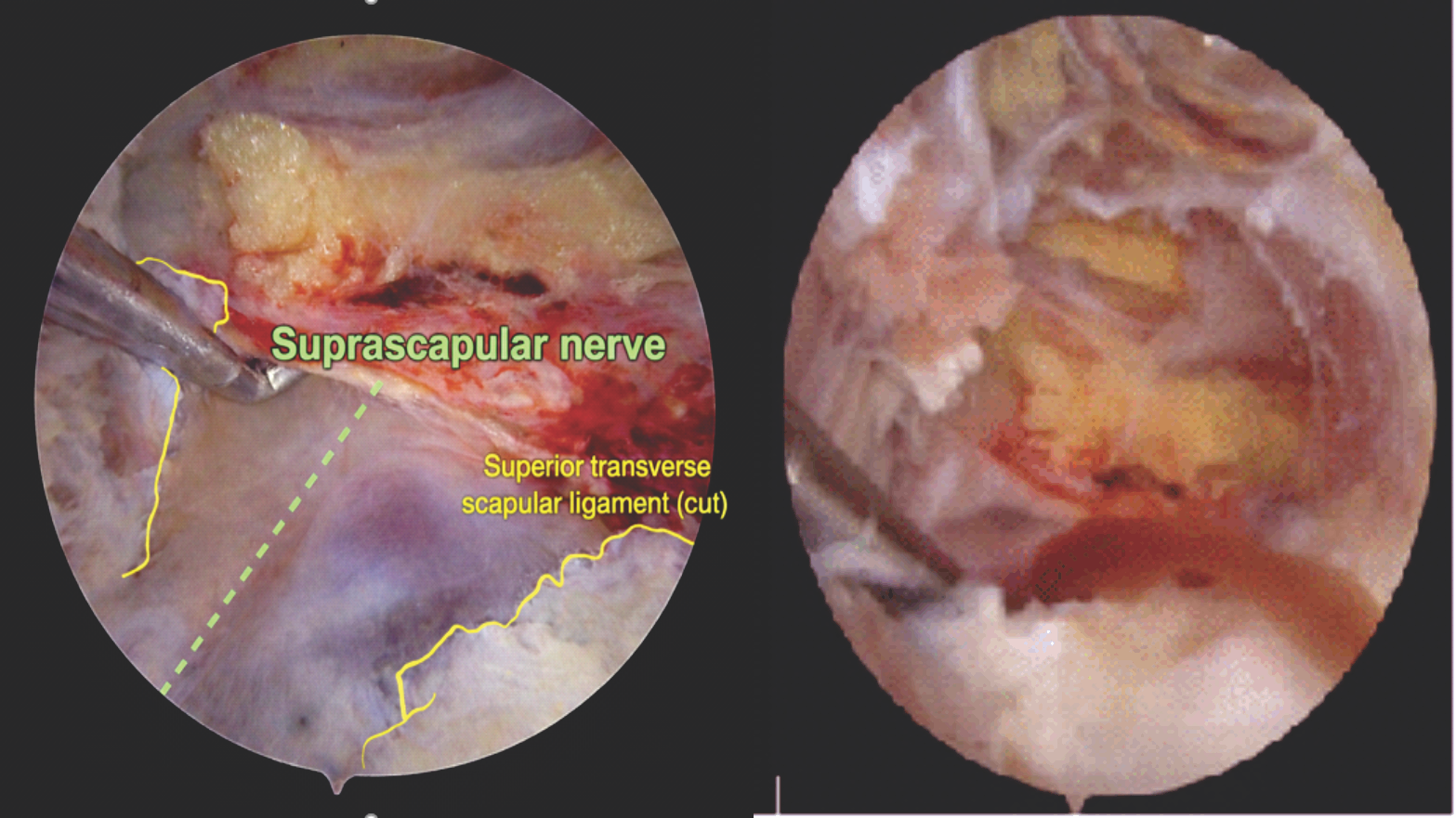 Figure 3: Arthroscopic view before (left) and after (right) the incision. This figure illustrates a suprascapular ganglion cyst causing suprascapular nerve compression at the suprascapular notch. Upon incision, a wine-red mucinous fluid was released. Yellow line: superior transverse scapular ligament (cut). Green dotted line: suprascapular nerve.