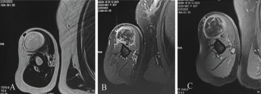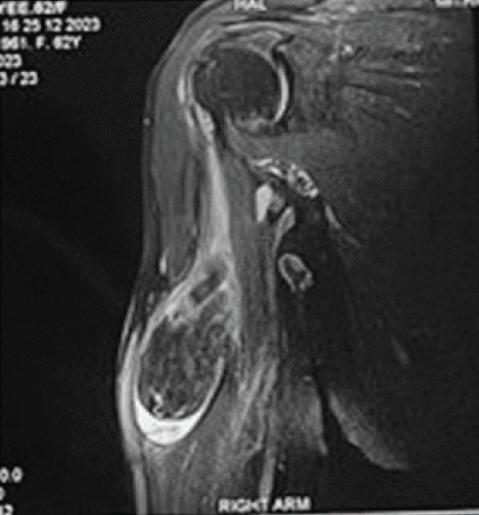 A 67-year-old female with complaints of painless swelling that progressively increased in size in the right shoulder and proximal arm for the past 8 months examination showed a palpable mass of size 8 × 5 cm non-tender with smooth surface and in the deeper planes of the shoulder girdle, mobile with firm consistency. All the shoulder movements were preserved. Plain radiographs of the right shoulder and arm were normal. Ultrasonogram showed an echogenic lesion with fluid collection in the biceps muscle plane and anterior aspect of the upper third of right arm. Magnetic resonance imaging (MRI) of the right shoulder and arm showed a well-defined space-occupying lesion of size 25 × 33 × 60 mm in the long head of biceps muscle with incomplete rupture of long head of biceps tendon at the level of supra glenoid tubercle (Fig. 1).