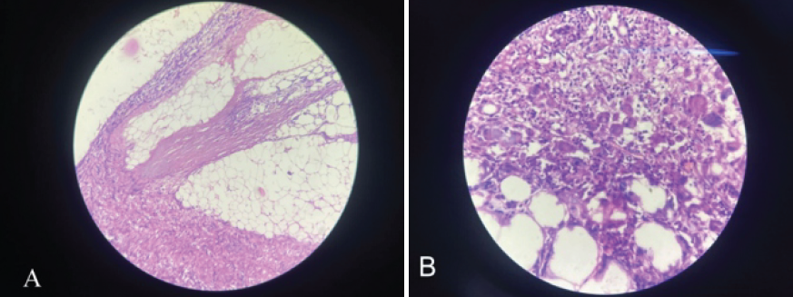 Figure 3: Histopathological examination of the excised mass from long head of biceps. Low power view showing mature adipocytes and few fibrous septae containing mixed inflammatory cells and lymphoid aggregates. Fibrinoid necrosis was observed and no abnormal micro vascularity around the sepate (hematoxylin and eosin stain, 10× magnification). (a) High-power view showed multinucleate giant cells in the fibrous septae. No spindle cells or lipoblasts were seen (b).