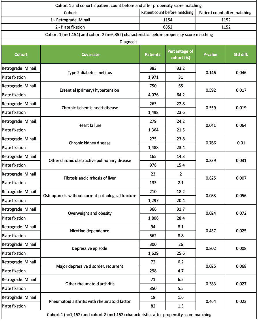 Table 1: Baseline demographics and clinical characteristics of patients undergoing retrograde intramedullary nail versus plate fixation before and after propensity score matching
