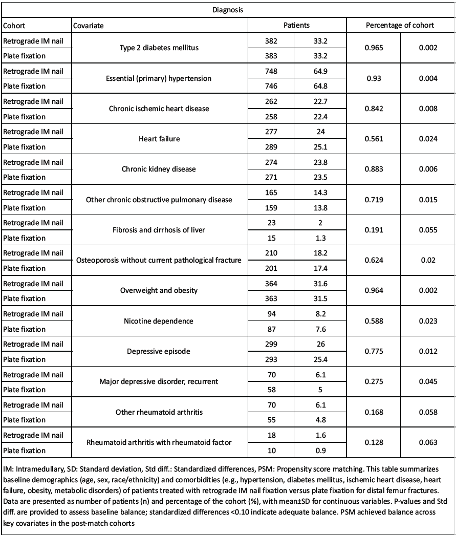 Because treatment assignment (nail vs. plate) was not randomized, we employed 1:1 PSM to reduce confounding. The two cohorts were matched for baseline characteristics using the TriNetX platform’s greedy nearest-neighbor algorithm (with no replacement). The propensity score model included demographic and comorbidity variables selected a priori based on clinical relevance to outcomes. We matched on age and sex (female vs. male), as well as the following comorbid conditions (coded as presence of diagnosis before the index event): Type 2 diabetes mellitus, hypertension, coronary artery disease (chronic ischemic heart disease), heart failure, chronic kidney disease, chronic lung disease (e.g., chronic obstructive pulmonary disease [COPD]), chronic liver disease (cirrhosis), osteoporosis, obesity, tobacco use (nicotine dependence), depression (major depressive disorder), and rheumatoid arthritis. These conditions were identified through ICD-10 codes (for example, E11 for diabetes, I10 for hypertension, I25 for ischemic heart disease, I50 for heart failure, N18 for CKD, J44 for COPD, K74 for cirrhosis, M81 for osteoporosis, E66 for obesity, F17 for nicotine dependence, F32/F33 for depression, M05/M06 for rheumatoid arthritis). The matching caliper and specifics followed TriNetX default settings to achieve balance.