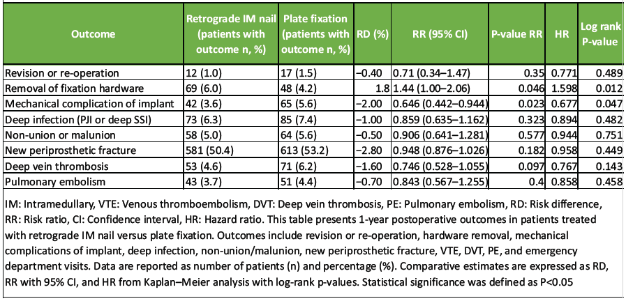 Table 2: One-year clinical outcomes in patients undergoing retrograde intramedullary nail versus plate fixation after distal femur fractures