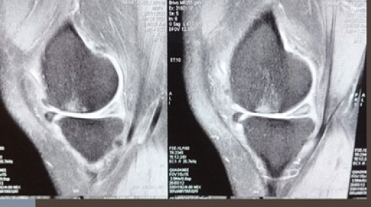 Figure 1: Pre-operative magnetic resonance imaging showing cartilage lesion of the medial femoral condyle.