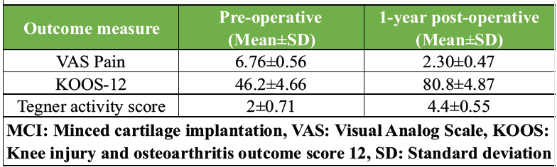 Materials and Methods: A retrospective analysis was conducted on five patients who underwent autologous MCI for International Cartilage Repair Society Grade 3 and 4 cartilage defects of the knee between 2022 and 2024. Autologous MCI involved harvesting autologous cartilage from the defect margins, mincing it, and implanting it into the lesion in a single procedure. Patient records were reviewed for demographic data, surgical details, and functional outcome scoring metrics preoperatively and 12 months post-surgery. Primary outcomes were assessed using the Knee Injury and Osteoarthritis Outcome Score-12, Tegner Activity Scale and Visual Analog Scale.